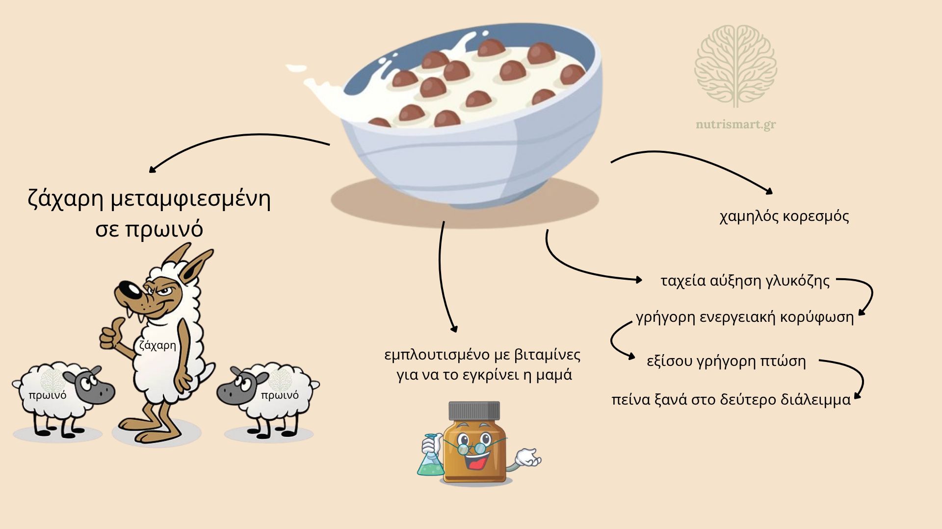 Ζάχαρη με λίγο δημητριακό: Τα περισσότερα δημητριακά του εμπορίου (ακόμα και τα "υγιεινά") αποτελούνται από 25% έως 35% ζάχαρη. Ουσιαστικά σερβίρεις στο παιδί ένα θρυμματισμένο μπισκότο μέσα σε γάλα και περιμένεις να μένει συγκεντρωμένο στο μάθημα.